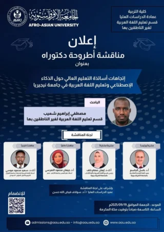 ✨ "في الآداب تُرعَى الثقافة… وبالعلوم الإنسانية يُصاغ الفكر" ✨ تُعلن كلية الآداب والعلوم الإنسانية في الجامعة الأفروآسيوية عن فتح باب القبول والتسجيل للطلاب الطموحين الراغبين في تعميق معرفتهم بالعلوم الإنسانية وتوسيع آفاقهم الثقافية والفكرية. وتُوفّر الكلية بيئة تعلمية متكاملة تزدهر بالإبداع والبحث، عبر باقة من البرامج والدورات المتميزة في الأدب، والتاريخ، والفلسفة، واللغات، والفنون البصرية والأدائية، تدعمها هيئة تدريسية متميزة تسعى لتعزيز الفضول الفكري والتفكير النقدي لدى الطلاب. 📚 الأقسام الأكاديمية المتوفرة: * علم النفس * علم الاجتماع * الجغرافيا * اللغة الفرنسية * اللغة الإنجليزية * اللغة العربية * التاريخ * الفلسفة * الوثائق والمكتبات * الترجمة والترجمة الفورية 💎 وتُطرح هذه البرامج على مستويات أكاديمية متعددة: البكالوريوس – الماجستير – الدكتوراه. 🔹 مميزات الدراسة في كلية الآداب والعلوم الإنسانية: * مناهج متعددة التخصصات تدمج بين الأدب والتاريخ والفلسفة واللغات والفنون، بما يعزز التفكير النقدي والإبداعي. * تطوير مهارات التحليل، التعبير، والبحث في مجالات ثقافية وإنسانية متنوعة. * تعزيز الوعي الثقافي والتفاهم بين الحضارات والعصور. * تشجيع بيئة أكاديمية نابضة تعزز الابتكار والتعبير الإبداعي في الوسائط الأدبية والفنية والعروض. * غرس قيم المواطنة، العدالة، المشاركة المدنية، والمسؤولية الاجتماعية في نفوس الطلاب. * تبني منظور عالمي من خلال الحوار والتعاون الثقافي للارتقاء بوعي الخريجين كمواطنين عالميين فاعلين. 🎯 منح وتسهيلات دراسية: انطلاقًا من رسالتها الأكاديمية ومسؤوليتها المجتمعية، تمنح الجامعة الأفروآسيوية جميع الملتحقين بها تخفيضًا بنسبة 50% من الرسوم الدراسية على كافة البرامج الأكاديمية. 📌 للتواصل والتسجيل: 📧 البريد الإلكتروني: admissions@aau.edu.so 🌐 الموقع الإلكتروني: www.aau.edu.so 📞 الهاتف: 201025517535+ #الجامعة_الأفروآسيوية_من_عبق_الثقافة_تنبع_قيادات_المستقبل ___________________________________________________________________ ✨ “In the Arts, culture is nurtured… and through the Humanities, thought is shaped.” ✨ The Faculty of Arts and Humanities at the Afro-Asian University is pleased to announce the opening of admission and registration for ambitious students who aspire to deepen their knowledge in the humanities and broaden their cultural and intellectual horizons. The Faculty provides a comprehensive learning environment that thrives on creativity and research, offering a distinguished range of programs and courses in literature, history, philosophy, languages, and the visual and performing arts. These programs are delivered by an esteemed faculty committed to fostering intellectual curiosity and critical thinking among students. 📚 Available Academic Departments: 📖 Psychology 🌍 Sociology 🗺️ Geography 🇫🇷 French Language 🇬🇧 English Language 🕌 Arabic Language 📜 History 💡 Philosophy 📚 Library and Archival Studies 🔄 Translation and Interpretation 💎 These programs are offered at multiple academic levels: Bachelor’s – Master’s – Doctorate. 🔹 Advantages of Studying at the Faculty of Arts and Humanities: 📘 Interdisciplinary curricula integrating literature, history, philosophy, languages, and arts to enhance critical and creative thinking. 📝 Development of analytical, expressive, and research skills across diverse cultural and humanistic fields. 🌐 Promotion of cultural awareness and intercultural understanding across civilizations and eras. 🎭 A dynamic academic environment that fosters innovation and creative expression through literary, artistic, and performance mediums. ⚖️ Instilling values of citizenship, justice, civic engagement, and social responsibility. 🤝 Embracing a global perspective through dialogue and cultural cooperation, preparing graduates as active global citizens. 🎯 Scholarships and Study Facilities: In line with its academic mission and social responsibility, the Afro-Asian University grants all enrolled students a 50% reduction in tuition fees across all academic programs. 📌 For Admission and Inquiries: 📧 Email: admissions@aau.edu.so 🌐 Website: www.aau.edu.so 📞 Phone: +201025517535 #Afro_Asian_University_From_the_Richness_of_Culture_Emerge_the_Leaders_of_the_Future